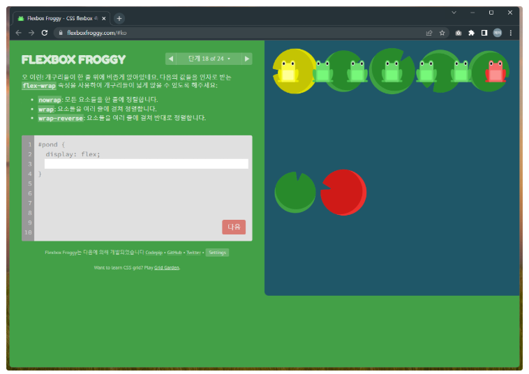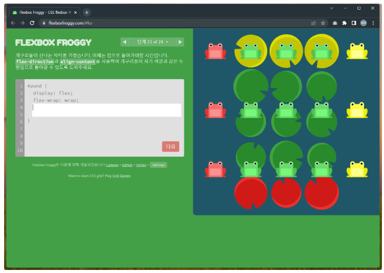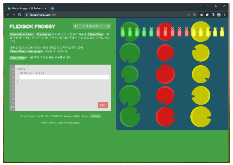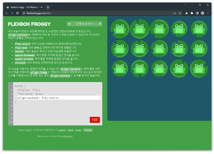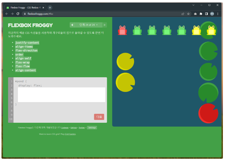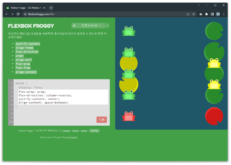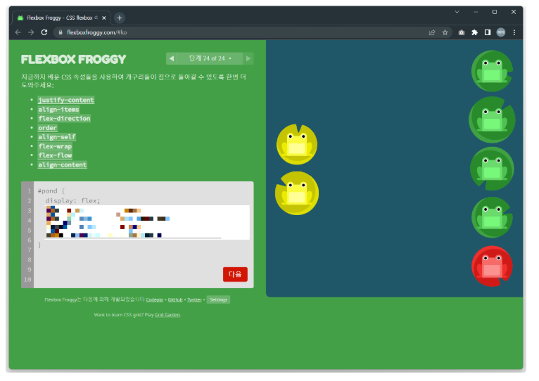이상으로 Flexbox Froggy 24 개의 문제를 함께 풀어보았습니다. 한 번에 Flex를 이해하기에는 다소 어려움이 있을 수도 있겠습니다. 하지만, 흥미를 갖고 반복적으로 사용하다 보면 자연스레 체득이 되더라구요.